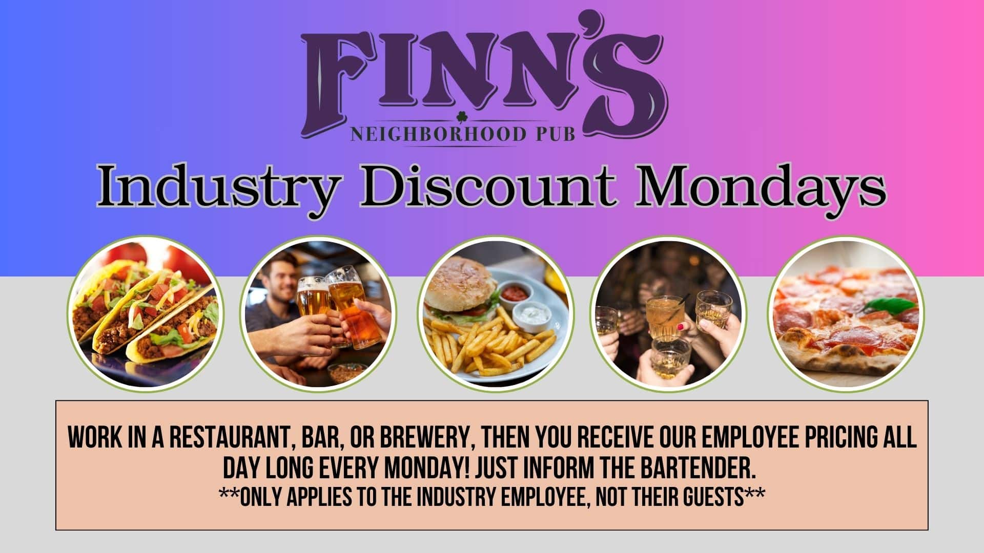 August 25 @ 2:00 pm - 11:45 pm Finn’s Industry Discount Mondays Do you work in a restaurant, bar, brewery, or food truck? If you do, then we would like to celebrate […]